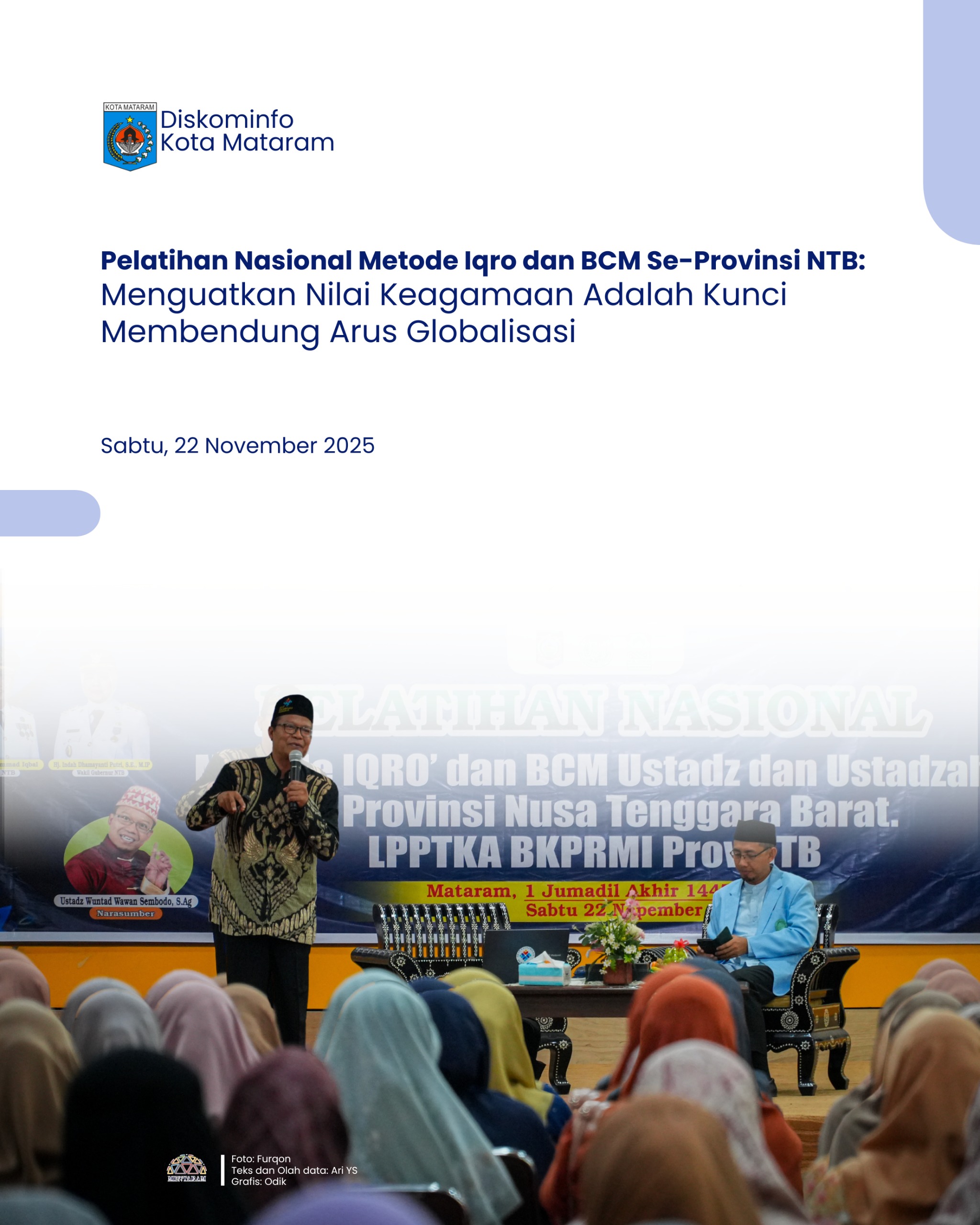 Antusiasme masyarakat untuk belajar dan mendalami Al-Qur’an terus meningkat dalam beberapa tahun terakhir. Fenomena positif ini, menurut Staf Ahli Bidang Ekonomi dan Pembangunan Kota Mataram, Zarkasyi, menjadi bukti bahwa masyarakat semakin menyadari pentingnya penguatan nilai keagamaan di tengah derasnya arus globalisasi. Pernyataan tersebut ia sampaikan saat membuka Pelatihan Nasional Metode Iqro serta Bermain, Cerita dan Menyanyi (BCM) bagi ustadz dan ustadzah se-Provinsi NTB yang digelar oleh LPPTKA BKPRMI NTB di Aula Lantai III Kantor Wali Kota Mataram, Sabtu (22/11/2025).