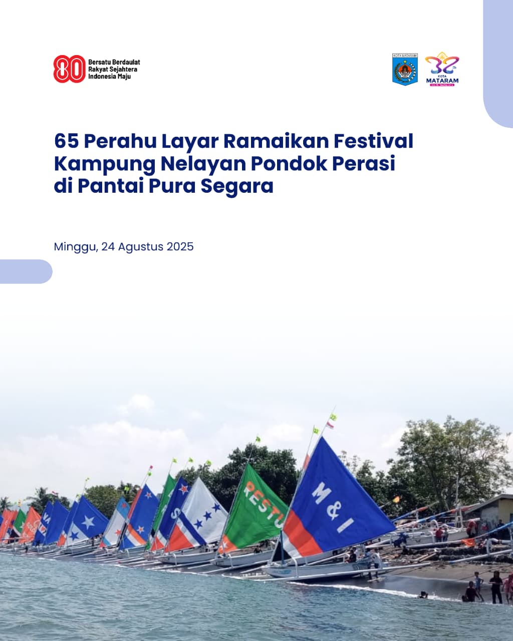 Wali Kota Mataram, H. Mohan Roliskana secara resmi membuka sekaligus melepas peserta lomba perahu layar bertajuk Festival Kampung Nelayan Pondok Perasi yang digelar di Pantai Pura Segara, Lingkungan Pondok Perasi, Kelurahan Bintaro, Kecamatan Ampenan, Kota Mataram, pada Minggu (24/08/2025).
