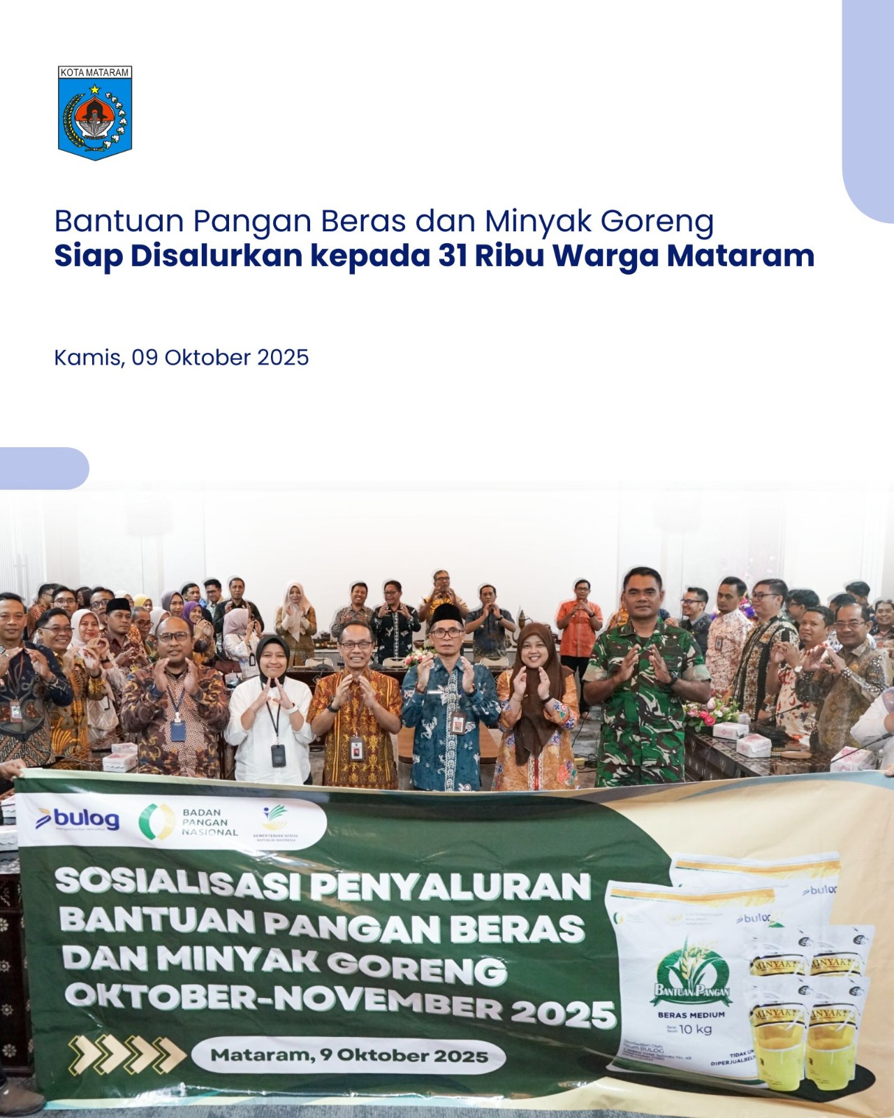 Kegiatan Sosialisasi Penyaluran Bantuan Pangan Beras dan Minyak Goreng Periode Oktober–November 2025 tersebut dibuka oleh Asisten II Bidang Perekonomian dan Pembangunan Setda Kota Mataram, H. Miftahurrahman. Narasumber pada kegiatan tersebut yaitu Endang Ismaryati dari Bapanas dan Dindi Wida Puparanti dari Bulog. Acara ini juga dihadiri oleh perwakilan Kodim 1606 Mataram, Polresta Mataram, Asisten I Setda Kota Mataram, Dinas Sosial Kota Mataram, Dinas Ketahanan Pangan Kota Mataram, Bagian Ekonomi Setda Kota Mataram, serta para camat dan lurah se-Kota Mataram.