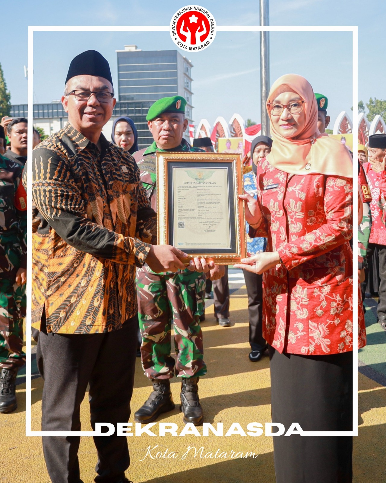 Penyerahan Hak Cipta Bros Gerbang Sangkareang kepada Ketua TP PKK sekaligus Ketua Dekranasda Kota Mataram, Hj. Kinnastri Mohan Roliskana, menjadi penegasan bahwa karya lokal Mataram tidak hanya memiliki nilai estetika, tetapi juga nilai filosofi dan legalitas sebagai identitas resmi yang perlu dijaga, dikembangkan, serta diwariskan.(Humas)
