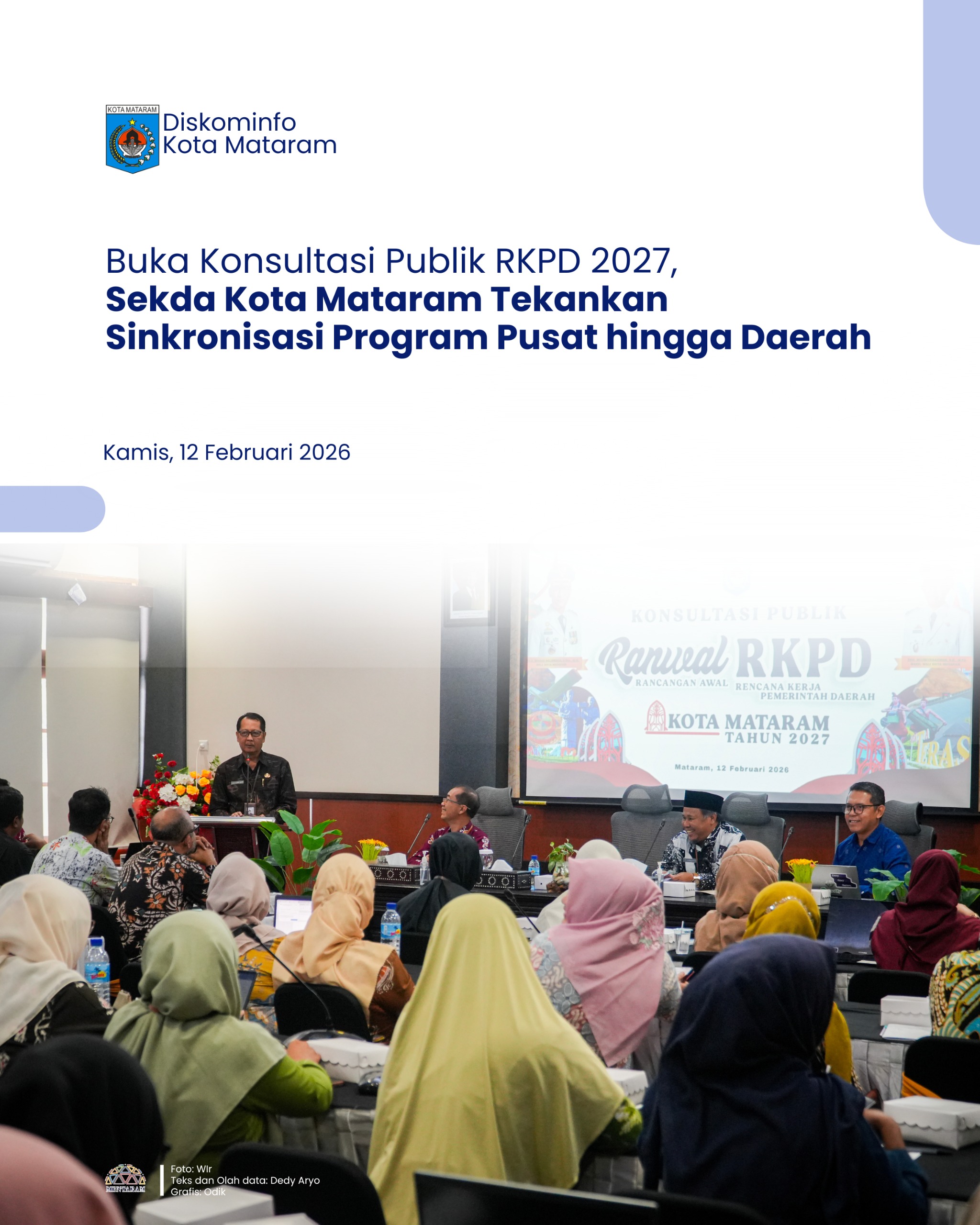Mataram — Sekretaris Daerah (Sekda) Kota Mataram, H. L. Alwan Basri, secara resmi membuka kegiatan Konsultasi Publik Rancangan Awal Rencana Kerja Pemerintah Daerah (RKPD) Kota Mataram Tahun 2027. Kegiatan tersebut berlangsung di Ruang Rapat Bappeda Kota Mataram, Kamis (12/02/2026), dan dihadiri Perwakilan Komisi II DPRD Kota Mataram, Bappeda Provinsi Nusa Tenggara Barat, akademisi, para pemangku kepentingan, serta jajaran Organisasi Perangkat Daerah (OPD) Kota Mataram.