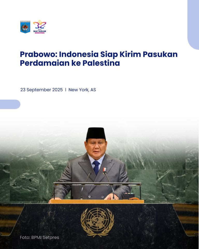 Prabowo: Indonesia Siap Kirim Pasukan Perdamaian ke Palestina New York — Presiden RI Prabowo Subianto menyatakan sikap tegas Indonesia untuk mendukung penyelesaian damai konflik Palestina–Israel. Ia menyerukan pengakuan segera terhadap negara Palestina dan penghentian tragedi kemanusiaan yang masih berlangsung di…