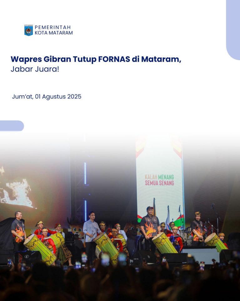 Wapres Gibran Tutup FORNAS di Mataram, Jabar Juara! Mataram, — Festival Olahraga Rekreasi Nasional (FORNAS) VIII tahun 2025 resmi ditutup oleh Wakil Presiden Republik Indonesia, Gibran Rakabuming, di panggung utama eks Bandara Selaparang, Kota Mataram, Nusa Tenggara Barat (NTB). Gelaran…