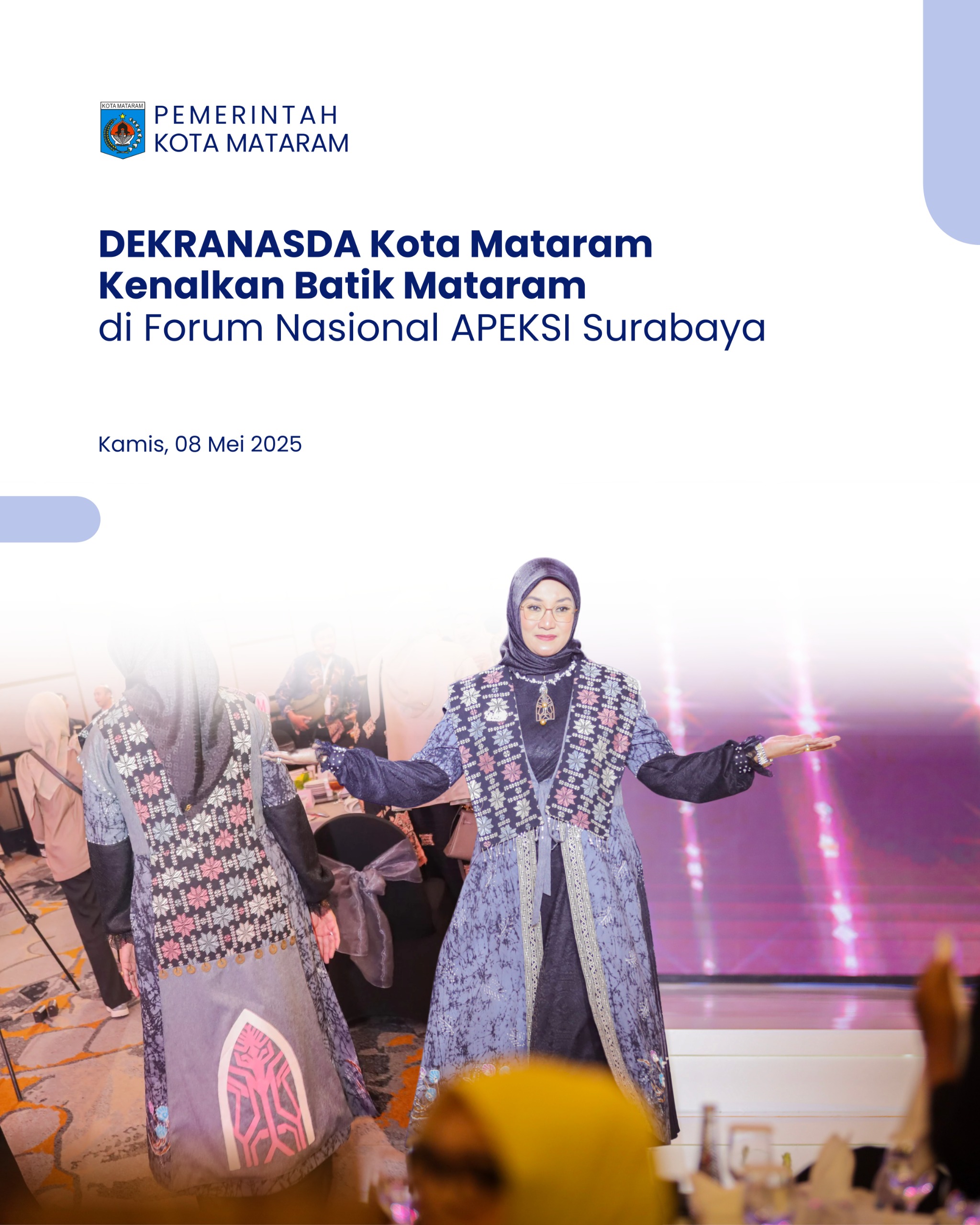 Surabaya (08/05/2025) — Dewan Kerajinan Nasional Daerah (Dekranasda) Kota Mataram memperkenalkan Batik Mataram kepada para peserta Ladies Program dalam rangkaian Rapat Kerja Nasional Asosiasi Pemerintah Kota Seluruh Indonesia (APEKSI) 2025 yang digelar di Kota Surabaya. Ketua Dekranasda Kota Mataram, Hj. Kinnastri Mohan Roliskana, secara langsung mempromosikan batik khas daerah tersebut di hadapan para istri wali kota dari berbagai penjuru Indonesia.