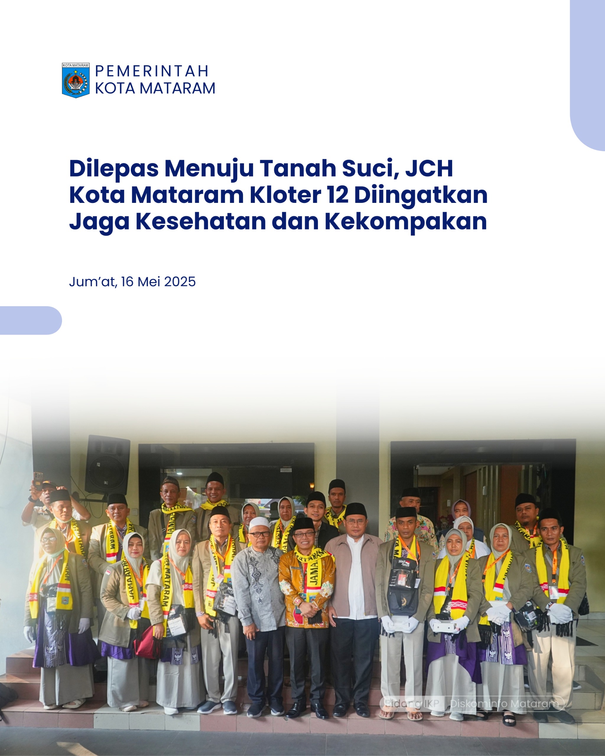 Sebanyak 17 orang Jamaah Calon Haji (JCH) Kota Mataram yang tergabung dalam Kloter 12, bersama dengan JCH Kabupaten Lombok Barat, Kabupaten Sumbawa, dan Kabupaten Dompu, resmi dilepas oleh Asisten I Bidang Pemerintahan dan Kesejahteraan Rakyat Sekretariat Daerah Kota Mataram, H. L. Martawang, yang berlangsung di Ruang Kenari, Kantor Wali Kota Mataram, pada Jumat (16/05/2025).