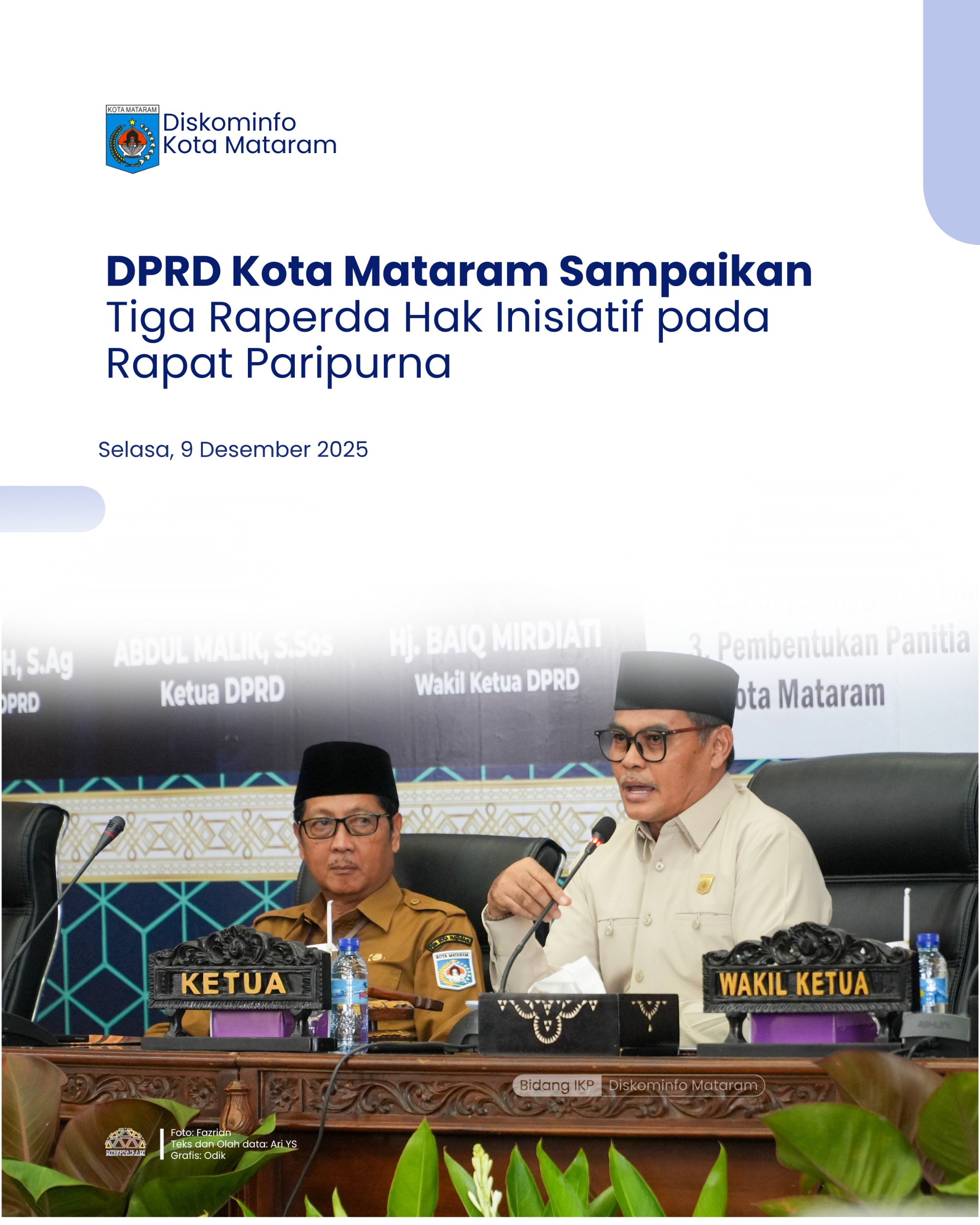 Mataram — DPRD Kota Mataram menyampaikan tiga Rancangan Peraturan Daerah (Raperda) Hak Inisiatif dalam Rapat Paripurna yang dihadiri oleh Sekretaris Daerah (Sekda) Kota Mataram, H. L. Alwan Basri. Rapat berlangsung di Ruang Rapat Utama DPRD Kota Mataram pada Selasa (09/12/2025).