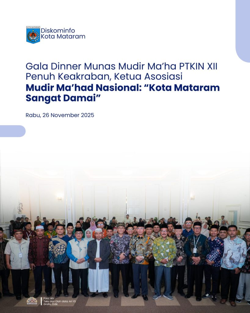 Mataram — Suasana penuh keakraban dan kekeluargaan mewarnai Gala Dinner Peserta Musyawarah Nasional (Munas) Mudir Ma’had Al-Jami’ah Perguruan Tinggi Keagamaan Islam Negeri (PTKIN) se-Indonesia XII Tahun 2025 bersama Pemerintah Kota Mataram. Kegiatan berlangsung di Pendopo Wali Kota Mataram pada Rabu malam (26/11/2025).