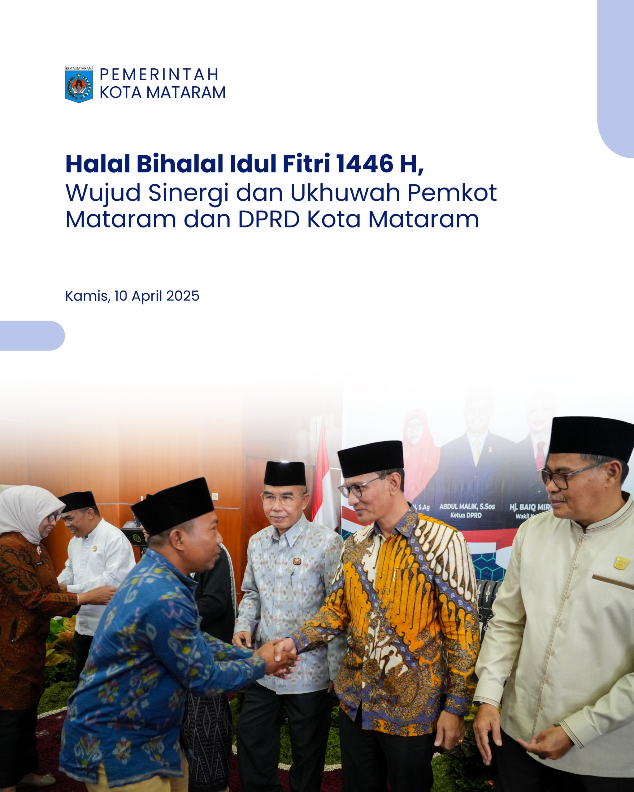 Mataram – Pemerintah Kota Mataram bersama Dewan Perwakilan Rakyat Daerah (DPRD) Kota Mataram menggelar acara Halal Bihalal Idul Fitri 1446 Hijriah yang berlangsung khidmat di Ruang Sidang Rapat Paripurna DPRD Kota Mataram, Kamis (10/04/2025).