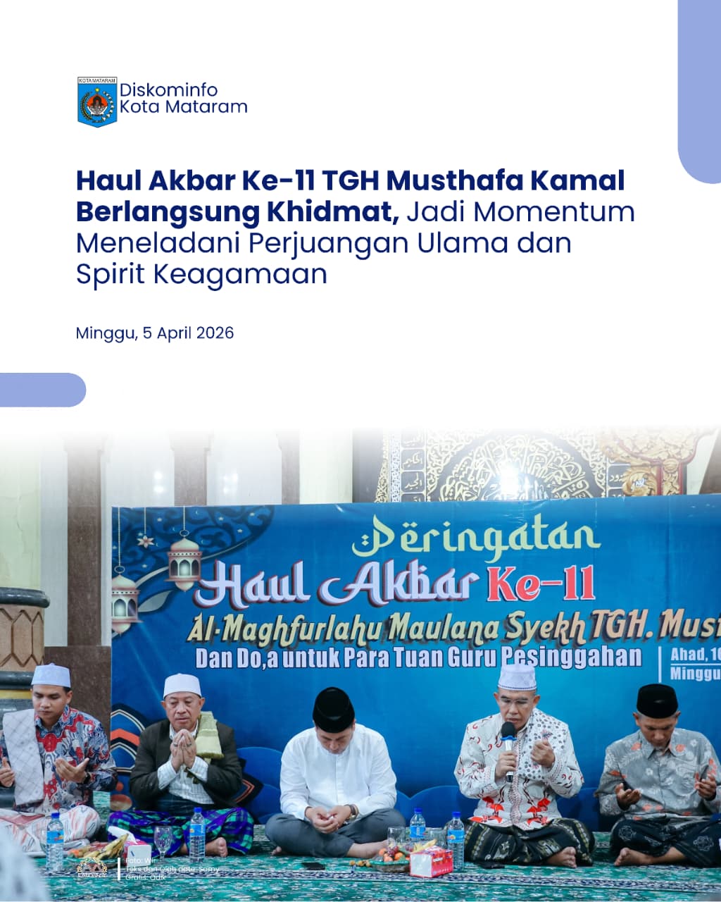 Suasana khidmat dan penuh makna mewarnai peringatan Haul ke-11 Almagfurlah Maulana Syekh TGH Musthafa Kamal serta doa bersama untuk para tuan guru yang digelar di Masjid Al Musthafa, Lingkungan Pesinggahan, Kelurahan Pagesangan Barat, Kecamatan Mataram, pada Minggu (05/04/2026).