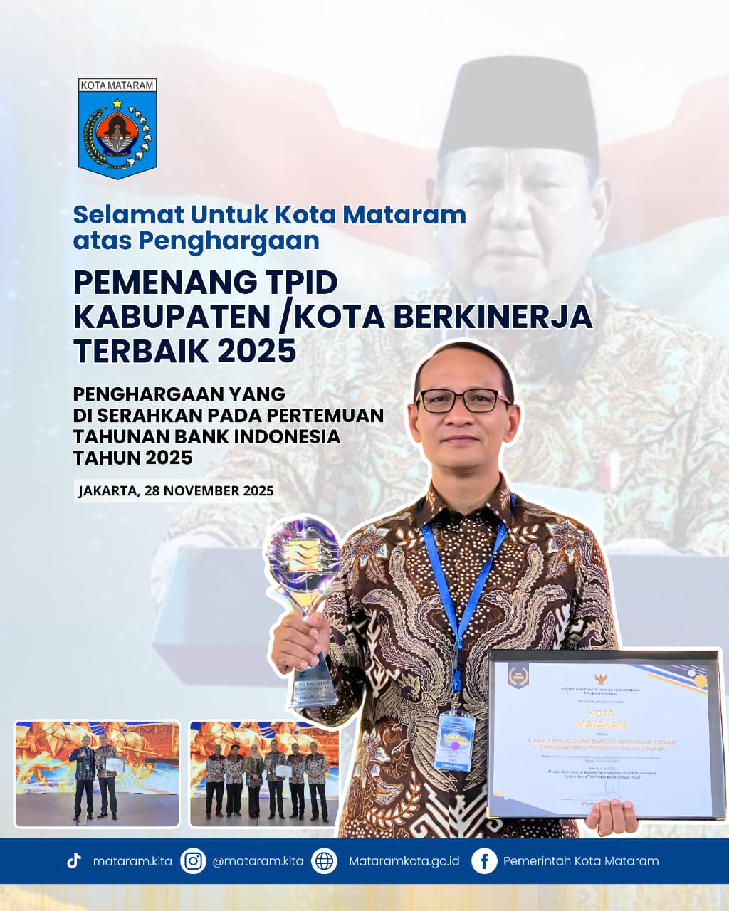 Jakarta 28/11/2025. Setelah tahun lalu, kembali tahun ini, Kota Mataram Tahun ini menyabet TPID Award Tahun 2025. Posisi Kota Mataram belum tergantikan sebagai yang terbaik dalam pengendali inflasi di daerah untuk Kawasan Nusa Tenggara, Maluku dan Papua. Penghargaan ini diterima oleh Walikota Mataram, H Mohan Roliskana, Jumat Malam (28/11/2025) bersamaan dengan Agenda Pertemuan Tahunan Bank Indonesia Tahun 2025 di Grha Bhasvara Icchana, Kompleks Bank Indonesia, Jakarta. Acara juga dihadiri langsung oleh Bapak Presiden Prabowo, Ketua DPR RI, Puan Maharani, Kapolri dan Panglima TNI serta para Menteri Kooordinator dan Menteri Kabinet Merah Putih, Kepala Lembaga Negara, Duta Besar serta Tuan Rumah, Gubernur Bank Indonesia.