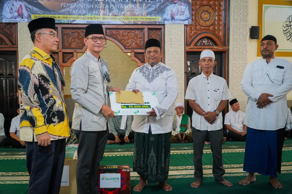 Pada kesempatan tersebut, Pemerintah Kota Mataram menyerahkan berbagai bantuan, di antaranya bantuan uang tunai sebesar Rp25 juta untuk Masjid Al Hidayah, bingkisan bagi jamaah, santunan untuk marbot, bantuan bagi guru ngaji dan majelis taklim, serta bantuan modal usaha dan rombong dari Baznas Kota Mataram sebagai bentuk dukungan terhadap pemberdayaan ekonomi masyarakat.