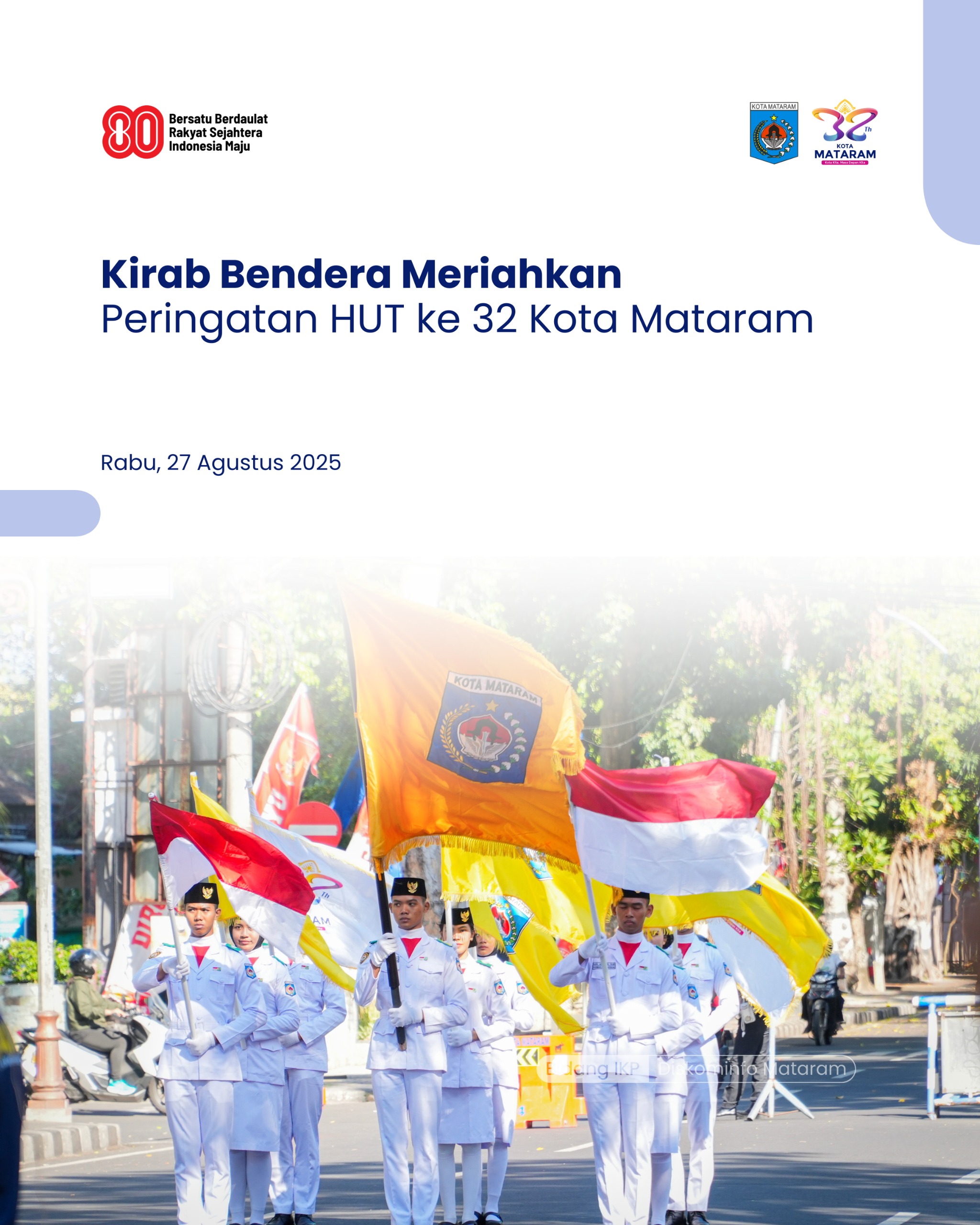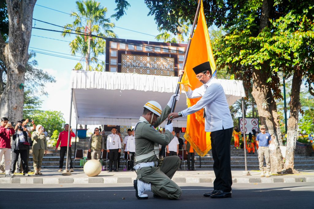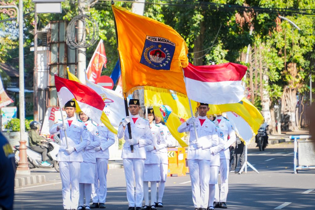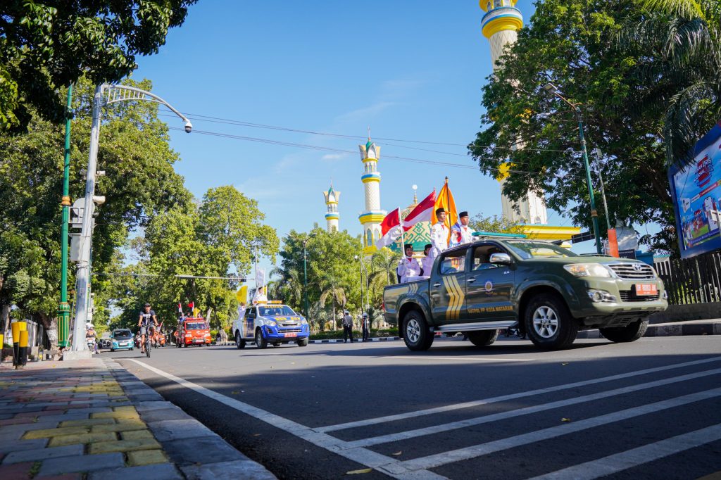 Mataram – Suasana penuh semangat mewarnai pelaksanaan Kirab Bendera dalam rangka peringatan Hari Ulang Tahun (HUT) ke-32 Kota Mataram yang digelar pada Rabu pagi (27/8), di depan Kantor Wali Kota Mataram, Jln. Pejanggik. Kegiatan ini berlangsung meriah dengan partisipasi berbagai unsur, mulai dari perangkat daerah, pelajar, organisasi masyarakat, hingga komunitas seni dan budaya.