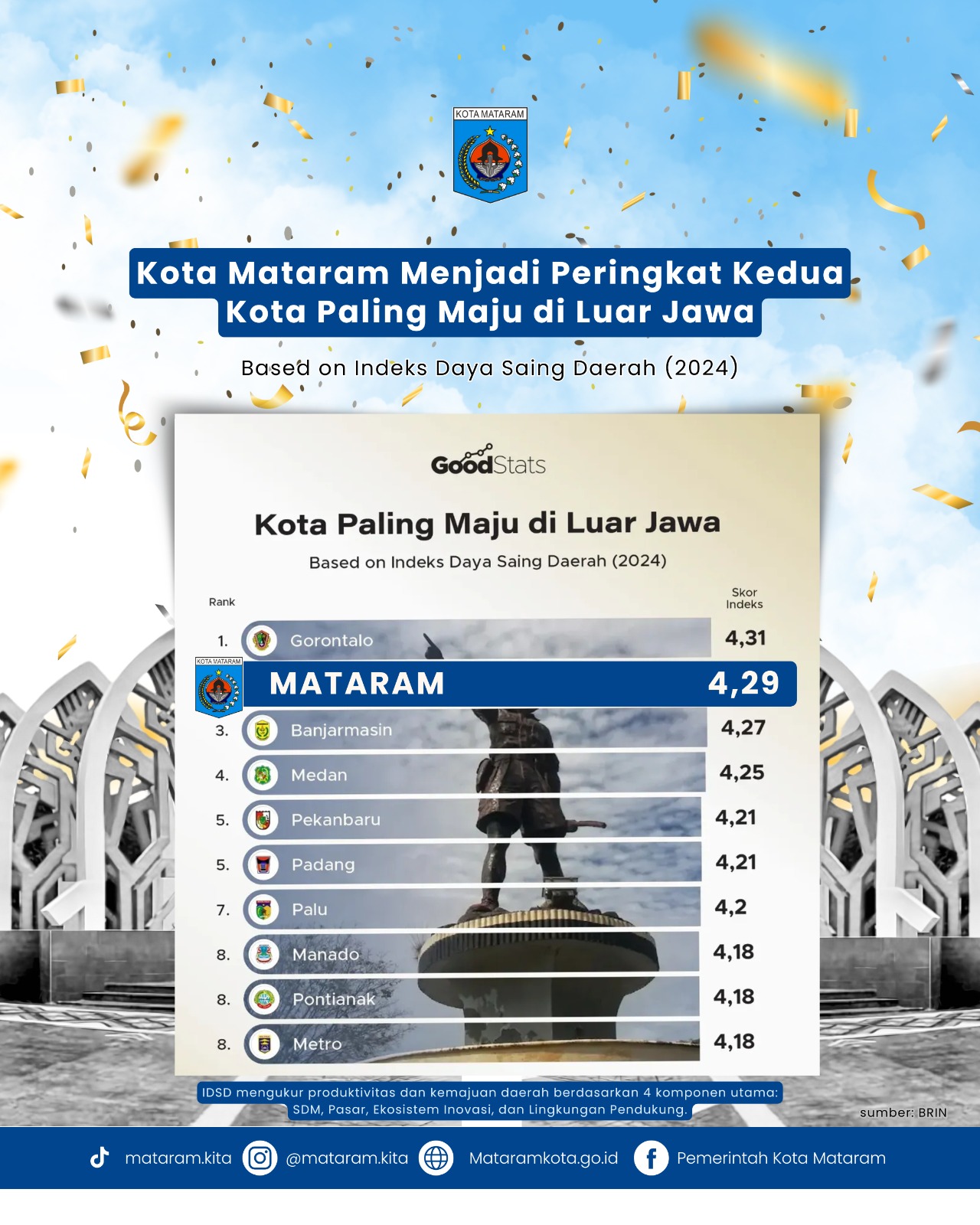 Kota Mataram kembali menorehkan prestasi membanggakan! Berdasarkan Indeks Daya Saing Daerah (IDSD) 2024, Mataram berhasil meraih peringkat ke-2 kota paling maju di luar Pulau Jawa. Capaian ini menunjukkan komitmen kuat pemerintah daerah dan seluruh elemen masyarakat dalam membangun kota yang kompetitif, inovatif, dan berdaya saing tinggi.