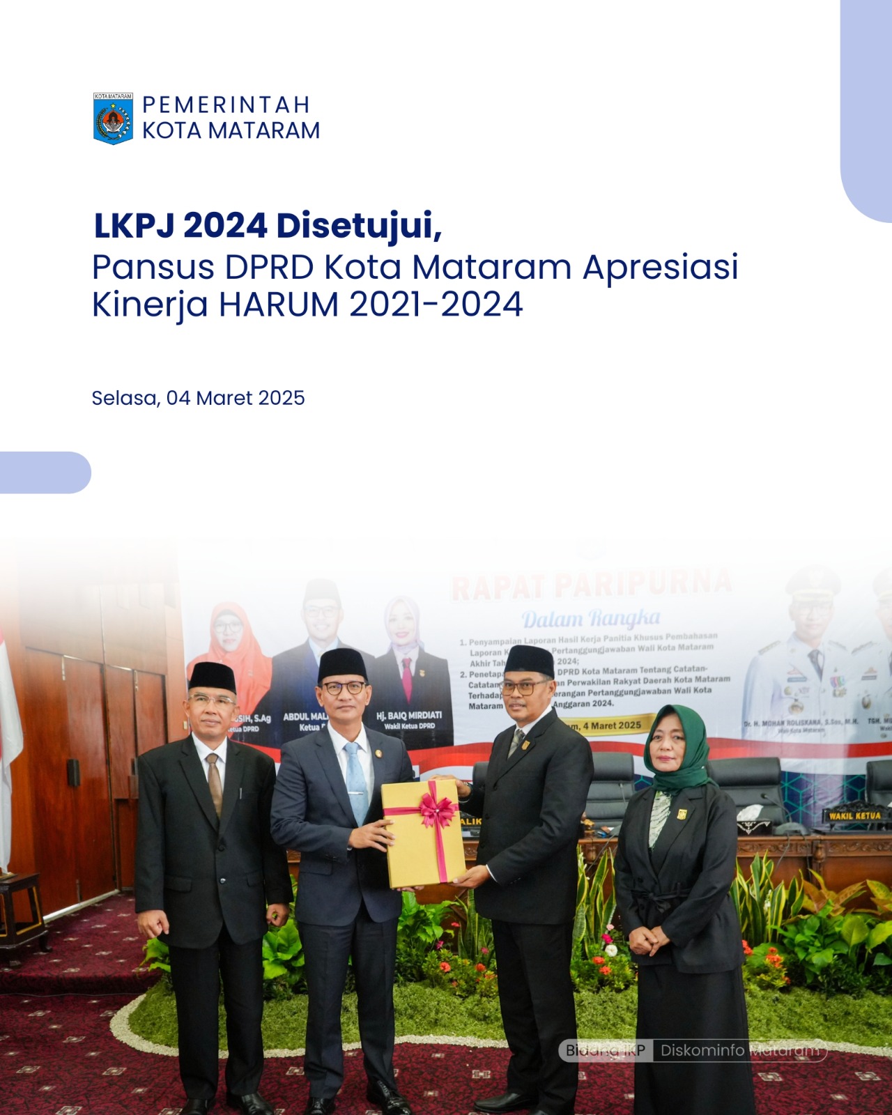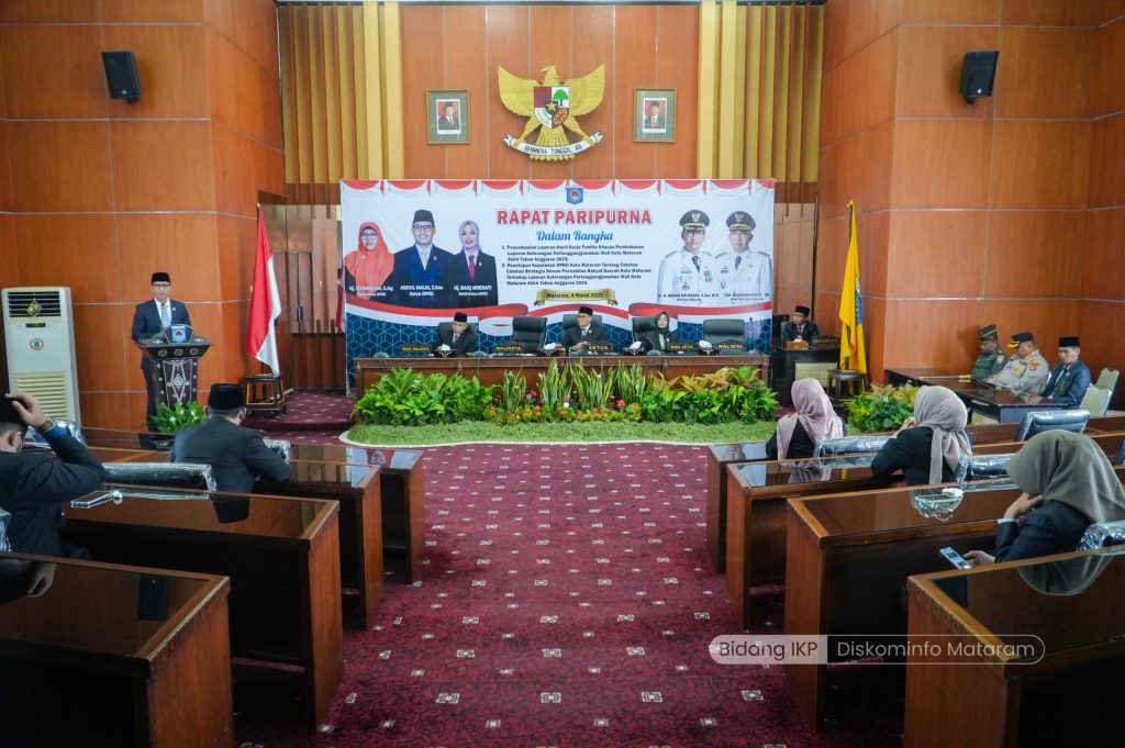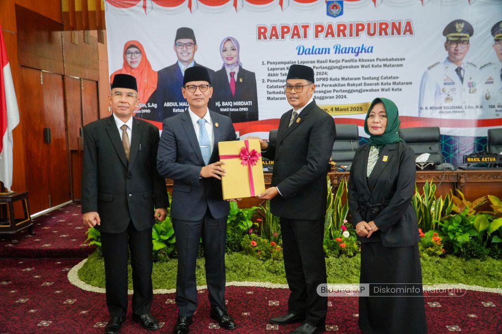 Wali Kota Mataram, H. Mohan Roliskana didampingi Wakil Wali Kota Mataram, TGH. Mujiburrahman menghadiri Rapat Paripurna DPRD Kota Mataram dengan agenda Penyampaian Laporan Hasil Kerja Panitia Khusus (Pansus) Pembahasan Laporan Keterangan Pertanggungjawaban (LKPJ) Wali Kota Mataram Akhir Tahun Anggaran 2024. Rapat tersebut juga membahas Penetapan Keputusan DPRD Kota Mataram tentang Catatan-Catatan Strategis terhadap LKPJ Wali Kota Mataram Akhir Tahun Anggaran 2024. Kegiatan ini berlangsung di Ruang Rapat Utama DPRD Kota Mataram dan dibuka secara resmi oleh Ketua DPRD Kota Mataram, Abdul Malik, pada Selasa (04/03/2025).