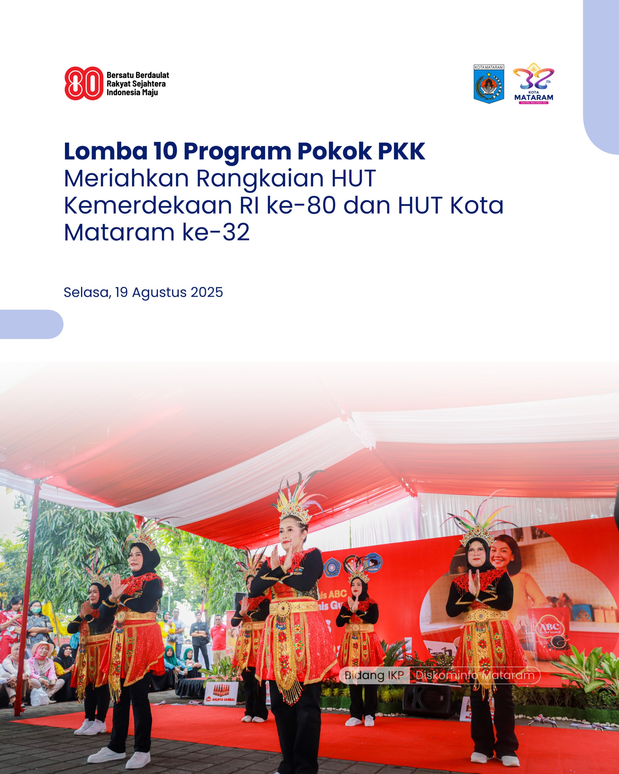 Mataram – Rangkaian panjang kegiatan dalam rangka memperingati HUT ke-80 Kemerdekaan Republik Indonesia sekaligus menyongsong HUT ke-32 Kota Mataram terus bergulir. Salah satunya adalah Lomba 10 Program Pokok PKK yang dirangkaikan dengan Puncak Peringatan Hari Kesatuan Gerak (HKG) PKK ke-53, bekerja sama dengan ABC, yang berlangsung meriah di Halaman Kantor Wali Kota Mataram, Selasa (19/08/2025).