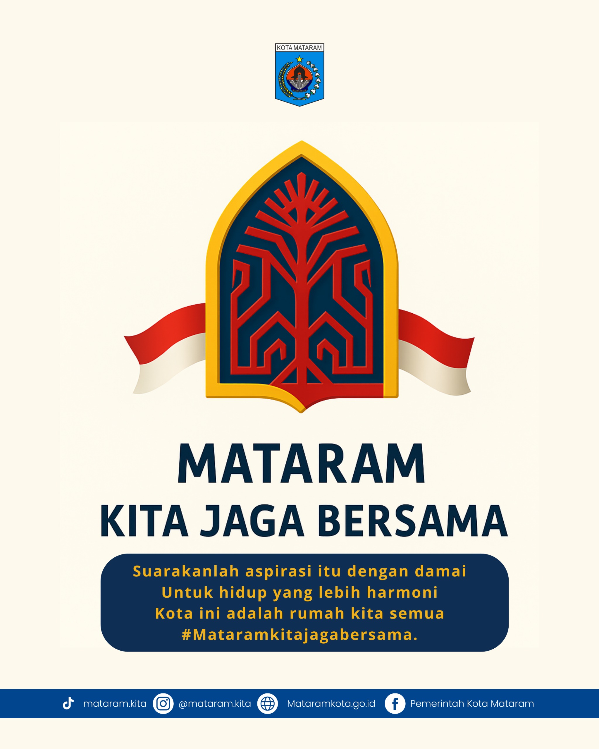 Mataram Kita Jaga BersamaOnSeptember 1, 2025InBerita Suarakanlah aspirasi itu dengan damai Untuk hidup yang lebih harmoni Kota ini adalah rumah kita semua Mataram Kita Jaga Bersama Share your love Previous Post Bros Gerbang Sangkareang – Simbol Identitas dan Kebanggaan Kota Mataram Next Post Pembukaan Festival Hadrah di Lingkungan Pesinggahan, TGH Mujiburrahman: Maulid Nabi Momentum Tingkatkan Persatuan dan Ukhuwah Newsletter Updates Enter your email address below and subscribe to our newsletter Subscribe