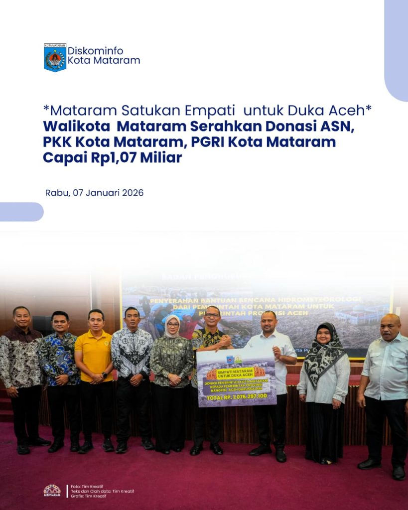 JAKARTA— Pemerintah Kota Mataram menunjukkan solidaritas kemanusiaan bagi masyarakat Aceh yang terdampak bencana banjir dan longsor melalui penggalangan dana bersama lintas elemen. Aksi kepedulian ini melibatkan ASN Pemerintah Kota Mataram, TP PKK Kota Mataram, PGRI Kota Mataram, Baznas, serta berbagai unsur lainnya, dengan total donasi yang terkumpul mencapai Rp1.076.297.100.
