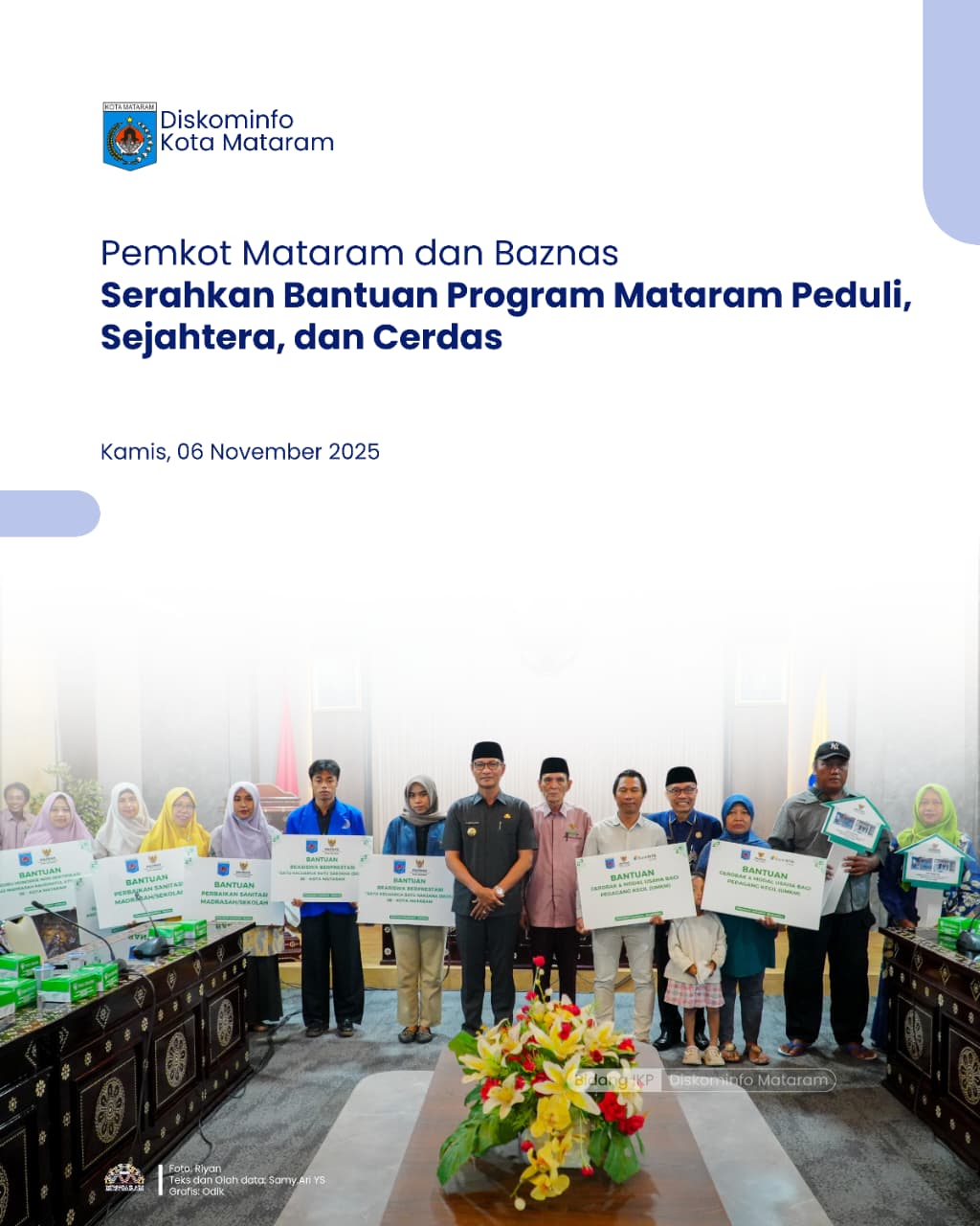 Mataram — Pemerintah Kota Mataram bersama Badan Amil Zakat Nasional (Baznas) Kota Mataram menyerahkan sejumlah bantuan kepada masyarakat melalui tiga program unggulan, yakni Mataram Peduli, Mataram Sejahtera, dan Mataram Cerdas. Wali Kota Mataram, H. Mohan Roliskana, mengatakan bahwa Baznas memiliki peran penting dalam menjembatani upaya pemerintah untuk menghadirkan program pemberdayaan masyarakat di berbagai sektor.