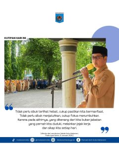 “Khusus yang menangani kebencanaan, satgas bencana saya minta untuk lebih fokus dalam mempersiapkan semuanya. Posko, SDM, dan man power harus benar-benar siap. Kita melihat kondisi cuaca cukup ekstrem dalam beberapa pekan terakhir dan berpotensi berlanjut ke depan, dengan angin yang mulai kencang dan hujan yang terus mengguyur. Saya berharap semangat Bapak dan Ibu tidak berkurang untuk terus memberikan pelayanan terbaik kepada masyarakat,” tegas Wali Kota.