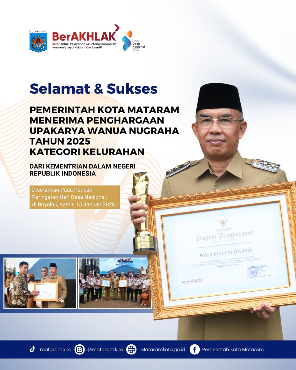 Pemerintah Kota Mataram kembali mencatatkan prestasi di tingkat nasional dengan menerima Penghargaan Upakarya Wanua Nugraha pada puncak peringatan Hari Desa Nasional 2026 di Boyolali, Jawa Tengah. Penghargaan ini diterima langsung oleh Wakil