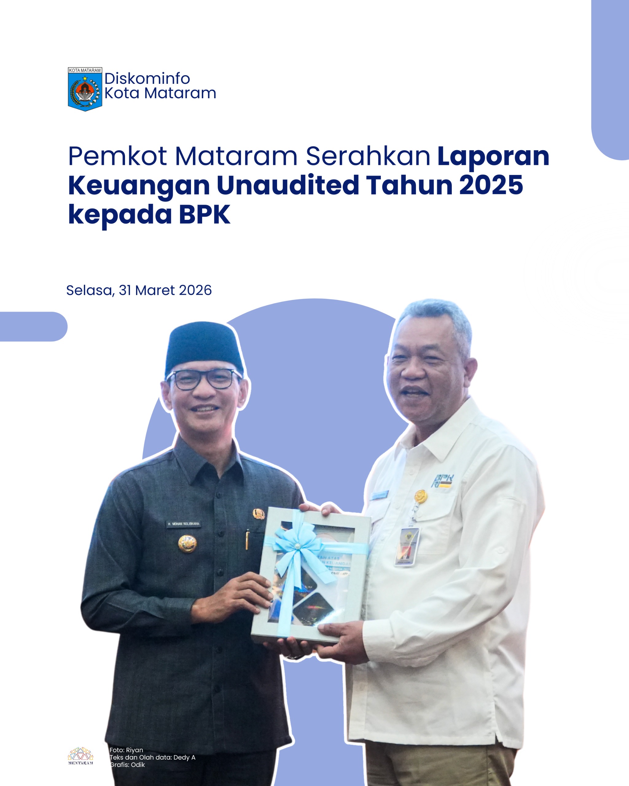 Melalui penyerahan Laporan Keuangan Unaudited Tahun 2025 ini, Pemerintah Kota Mataram menegaskan komitmennya untuk terus menjaga konsistensi dalam pengelolaan keuangan daerah yang profesional, tertib, dan berorientasi pada prinsip efisiensi, efektivitas, serta akuntabilitas dalam penyelenggaraan pemerintahan dan pelayanan kepada masyarakat.