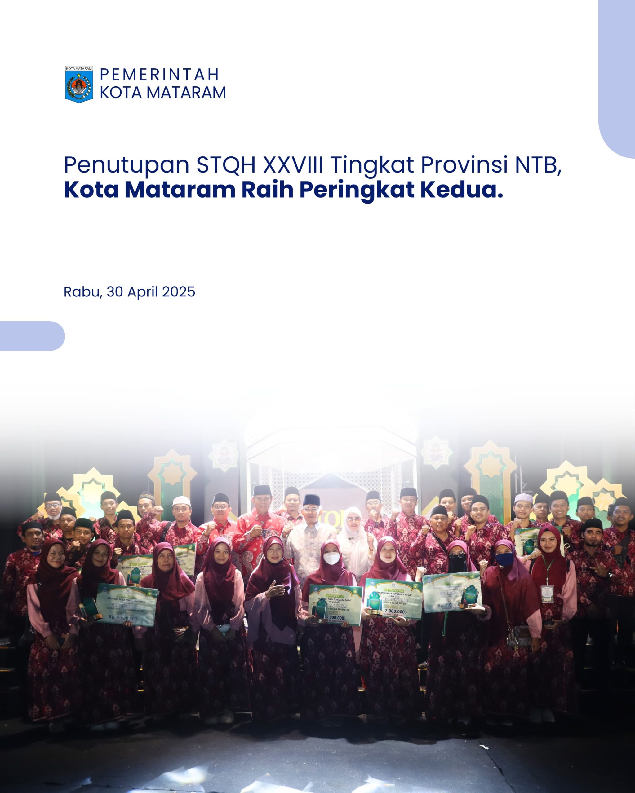 Kota Mataram berhasil menorehkan prestasi gemilang dengan meraih Peringkat II, memperoleh total nilai 152 poin. Capaian ini tertuang dalam Keputusan Dewan Hakim Nomor 03/DH/STQH-XXVIII/2025 tentang Penetapan Peringkat Terbaik Daerah pada Seleksi Tilawatil Qur’an dan Hadist ke-XXVIII Tingkat Provinsi Nusa Tenggara Barat di Kabupaten Sumbawa Tahun 2025.