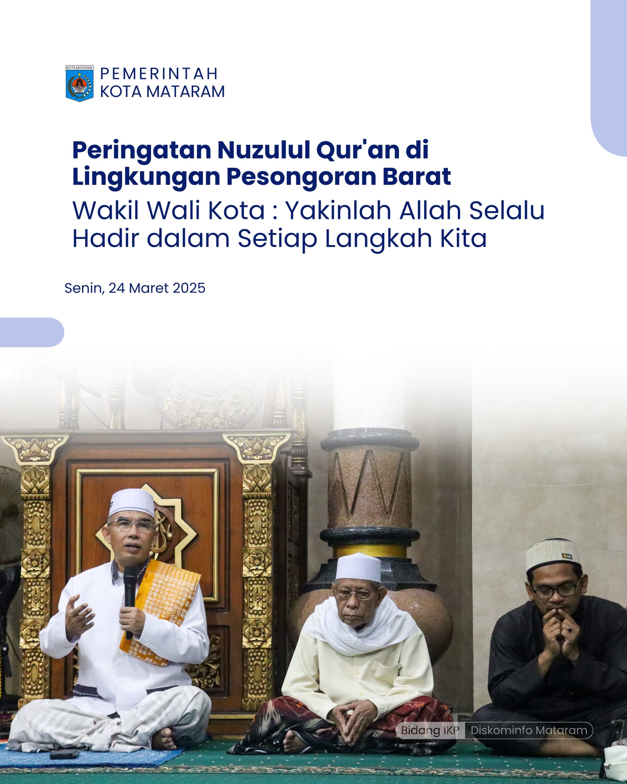 Mataram – Menjelang akhir bulan suci Ramadan, Wakil Wali Kota Mataram, TGH Mujiburrahman, mengajak masyarakat untuk memanfaatkan sisa hari di bulan penuh berkah ini dengan memperbanyak amal ibadah serta lebih merasakan kehadiran Allah Subhanahu wa Ta’ala dalam setiap ucapan dan perbuatan. Hal tersebut disampaikannya dalam peringatan Nuzulul Qur’an di Lingkungan Pesonggoran Barat, Kelurahan Pagutan Barat, Kecamatan Mataram, pada Senin (24/03/2025).