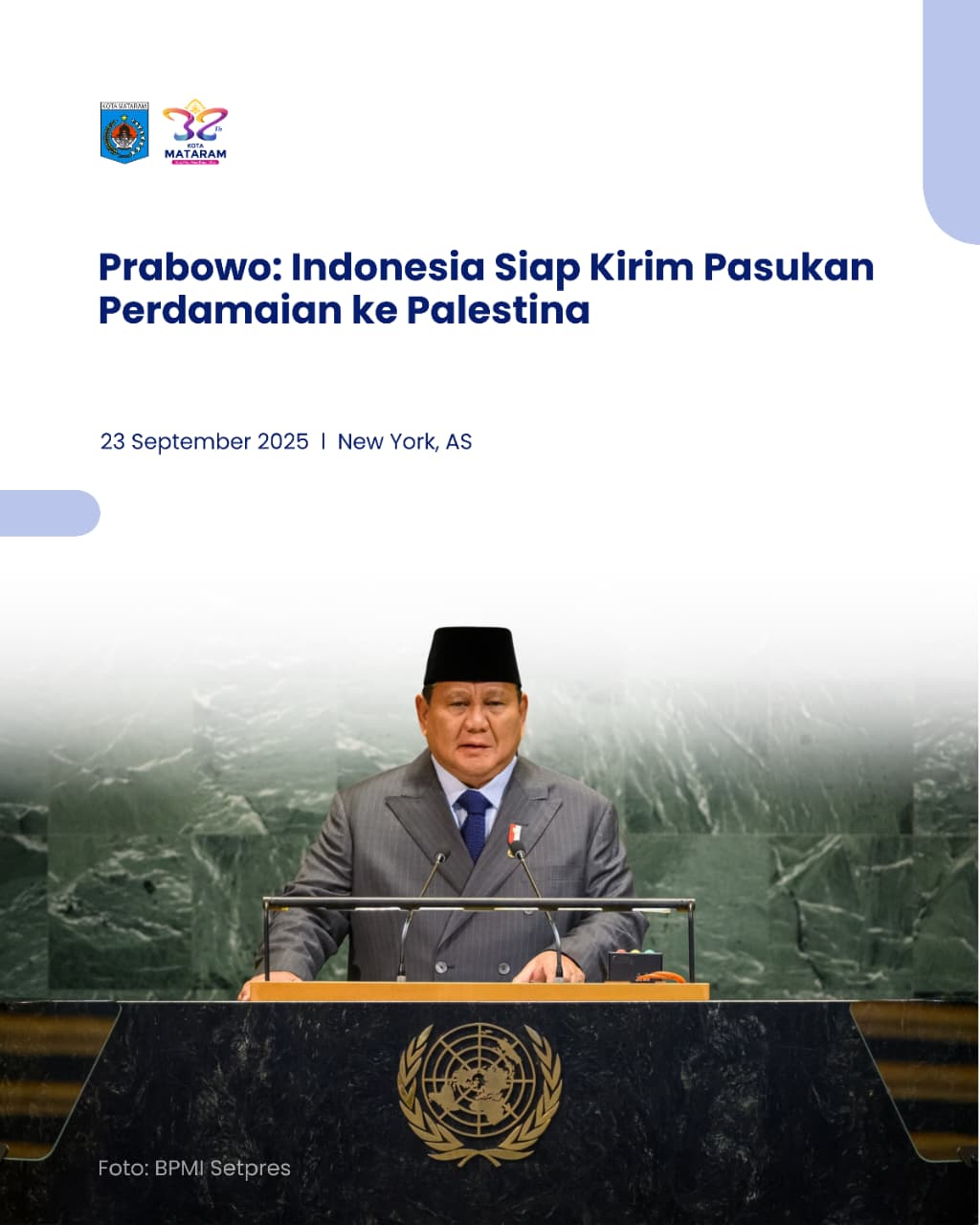 “Kita harus mengakui Palestina sekarang. Kita harus menghentikan bencana kemanusiaan di Gaza. Mengakhiri perang harus menjadi prioritas utama kita,” tegas Presiden Prabowo dalam pidatonya pada High-level International Conference on the Peaceful Settlement of the Question of Palestine and the Implementation of Two-State Solution di Markas Besar Perserikatan Bangsa-Bangsa (PBB), New York, Selasa (23/9) dini hari WIB.