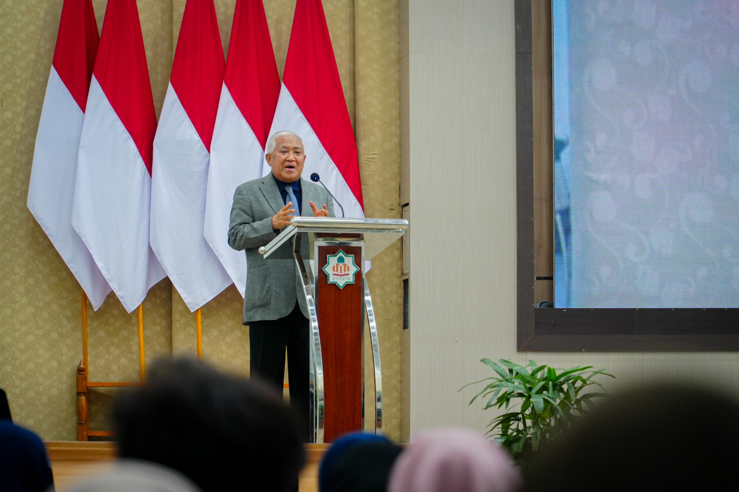 Lebih lanjut, Prof. Din menjelaskan bahwa pergeseran besar tengah terjadi di dunia, termasuk pergeseran gravitasi ekonomi global dari kawasan Atlantik menuju Indo-Pasifik, seiring dengan kebangkitan negara-negara Asia seperti Tiongkok. Ia juga menyinggung hasil kajian Dewan Interaksi Kelompok Mantan Kepala Negara dan Pemerintahan Dunia, yang menyimpulkan bahwa saat ini dunia mengalami “global damages” — kerusakan global yang bersifat akumulatif dan berpangkal pada sistem dunia yang rusak, yaitu sistem sekular-humanistik yang menafikan nilai-nilai spiritual dan kehidupan akhirat.