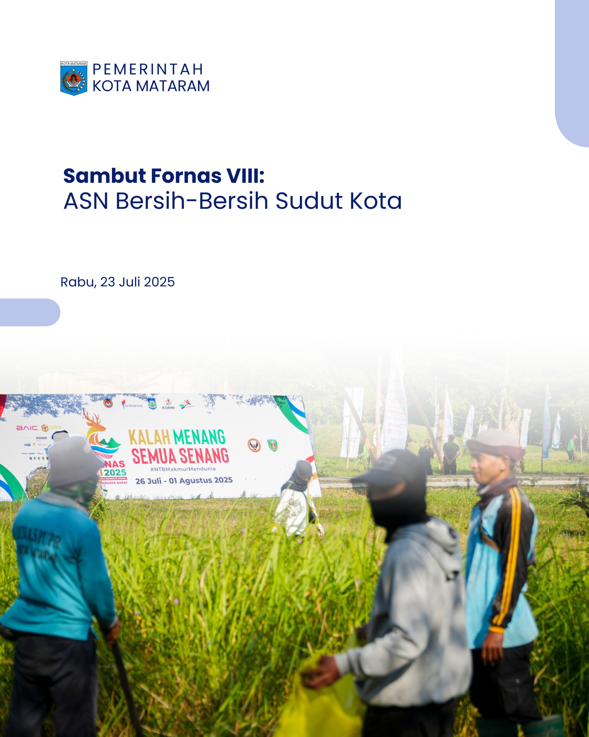 Pemerintah Kota Mataram mengajak seluruh lapisan masyarakat untuk turut serta menjaga kebersihan dan menjunjung tinggi semangat gotong royong demi kelancaran dan kesuksesan pelaksanaan FORNAS VIII 2025.