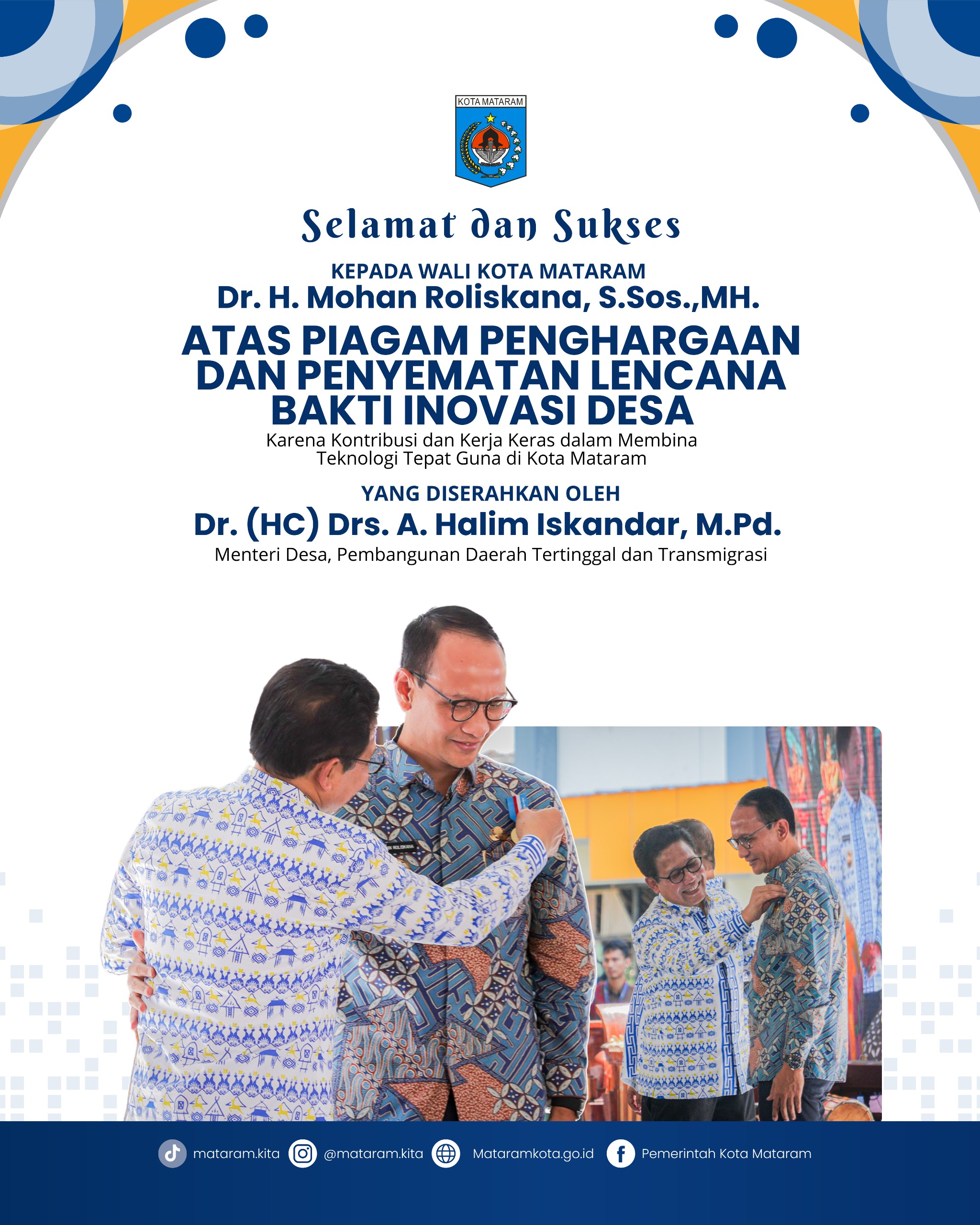 Mataram – Atas kontribusi dan kerja keras dalam membina teknologi tepat guna, Wali Kota Mataram, H Mohan Roliskana, kembali menerima piagam penghargaan Satya Lencana Bakti Inovasi Desa, yang disematkan langsung oleh oleh Menteri Desa, Pembangunan Daerah Tertingal dan Transmigrasi, Abdul Halim Iskandar, pada Senin (15/07/24), dalam acara Pembukaan Gelar Teknologi Tepat Guna Nusantara ke XXV, yang berlangsung di Islamic Centre Kota Mataram.