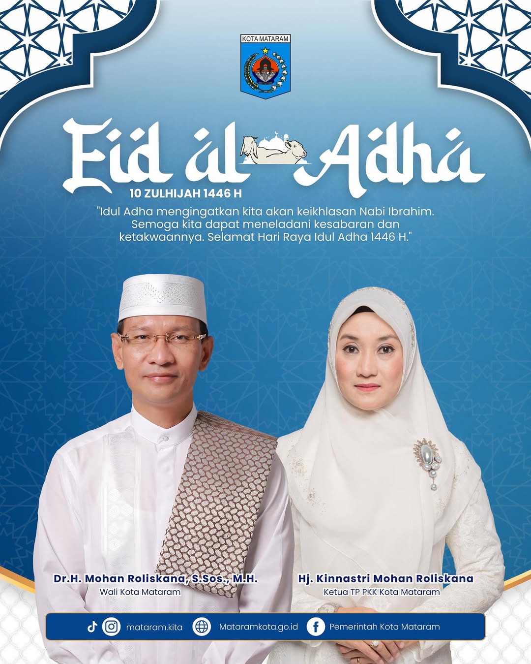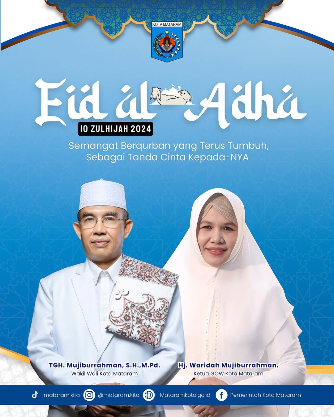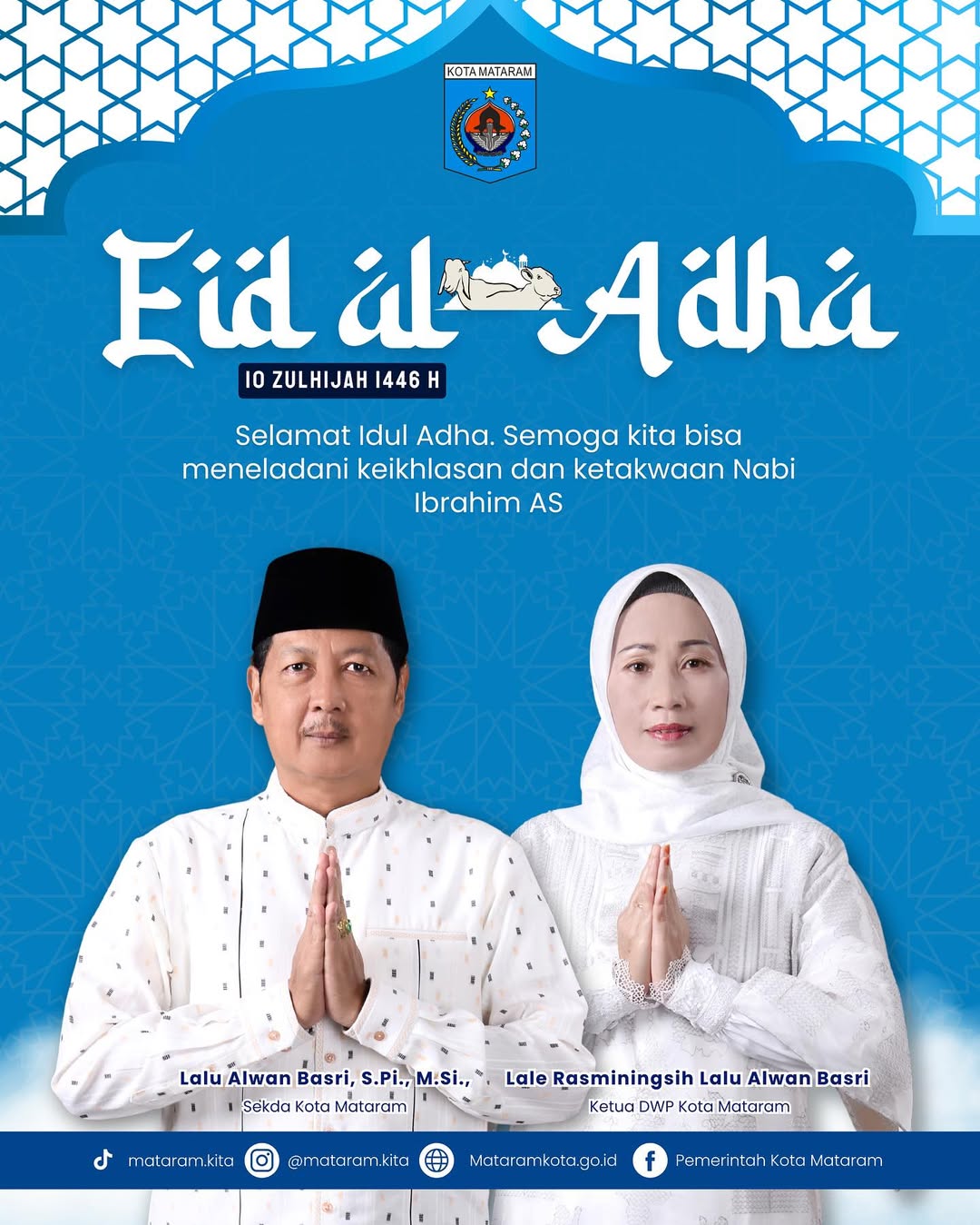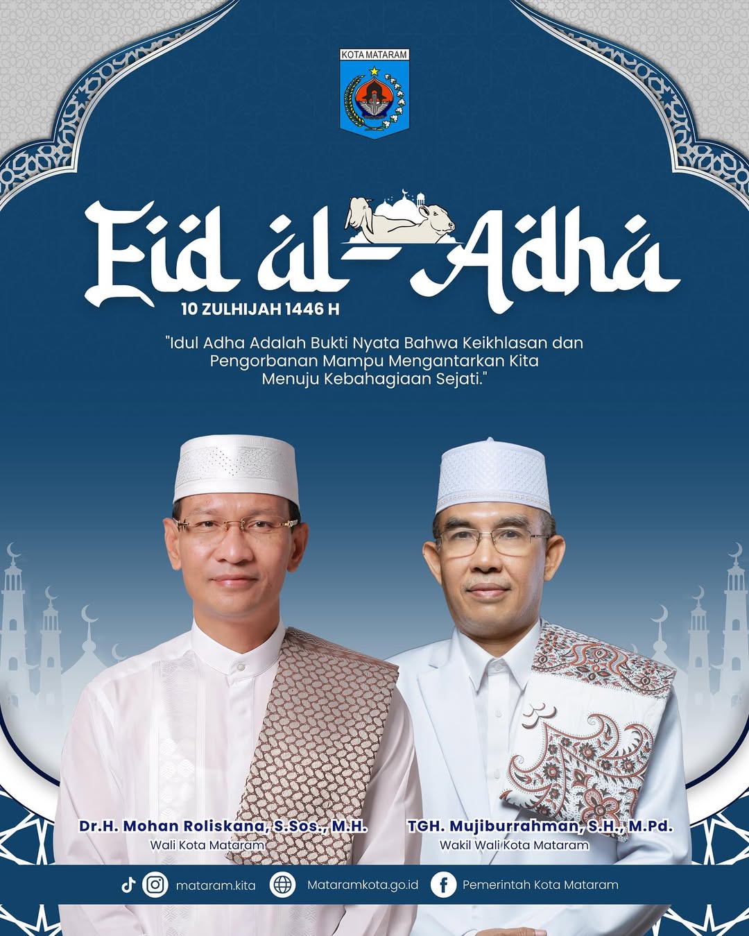 Selamat Hari Raya Idul Adha 1446 Hijriah! Atas nama seluruh jajaran Pemerintah Kota Mataram, kami mengucapkan selamat merayakan Hari Raya Kurban kepada seluruh masyarakat Kota Mataram. Semoga semangat Idul Adha tahun ini menginspirasi kita semua untuk terus meningkatkan kepedulian sosial, mempererat tali silaturahmi, dan berbagi kebahagiaan dengan sesama, terutama bagi mereka yang membutuhkan. Mari kita jadikan momen ini sebagai refleksi untuk selalu berkorban demi kebaikan bersama dan kemajuan kota tercinta.