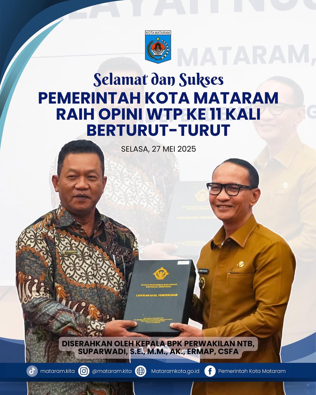 Opini WTP tersebut diterima langsung oleh Wali Kota Mataram, H. Mohan Roliskana, pada Selasa, 27 Mei 2025. Dalam kesempatan itu, beliau menyampaikan apresiasi dan terima kasih kepada seluruh jajaran yang telah bekerja keras menjaga integritas dan disiplin pengelolaan keuangan daerah demi kemajuan Kota Mataram.