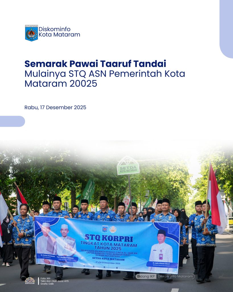 Mataram — Seleksi Tilawatil Qur’an Aparatur Sipil Negara (STQ ASN) Pemerintah Kota Mataram Tahun 2025 resmi dimulai, ditandai dengan pelaksanaan pawai ta’aruf yang berlangsung semarak pada Rabu (17/12/2025).