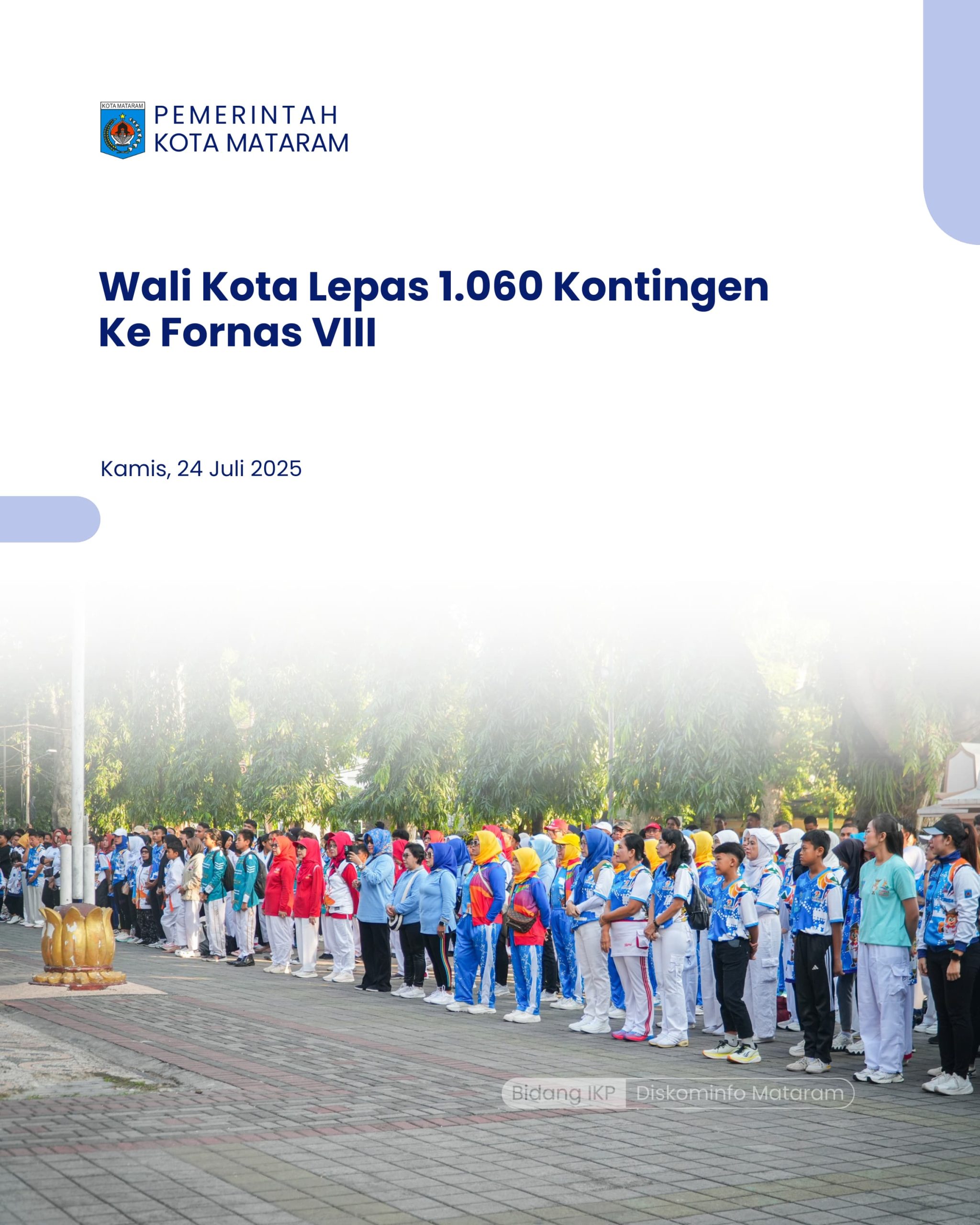 Mataram — Wali Kota Mataram, H. Mohan Roliskana, secara resmi melepas 1.060 kontingen Kota Mataram yang akan berlaga di ajang Festival Olahraga Masyarakat Nasional (FORNAS) VIII Tahun 2025. Acara pelepasan berlangsung di Halaman Kantor Wali Kota Mataram, pada Kamis (24/07/2025), dengan dihadiri oleh Wakil Wali Kota Mataram, TGH Mujiburrahman, unsur Forkopimda, para Asisten Setda Kota Mataram, pimpinan OPD Kota Mataram, para pegiat, Official dan pelatih.