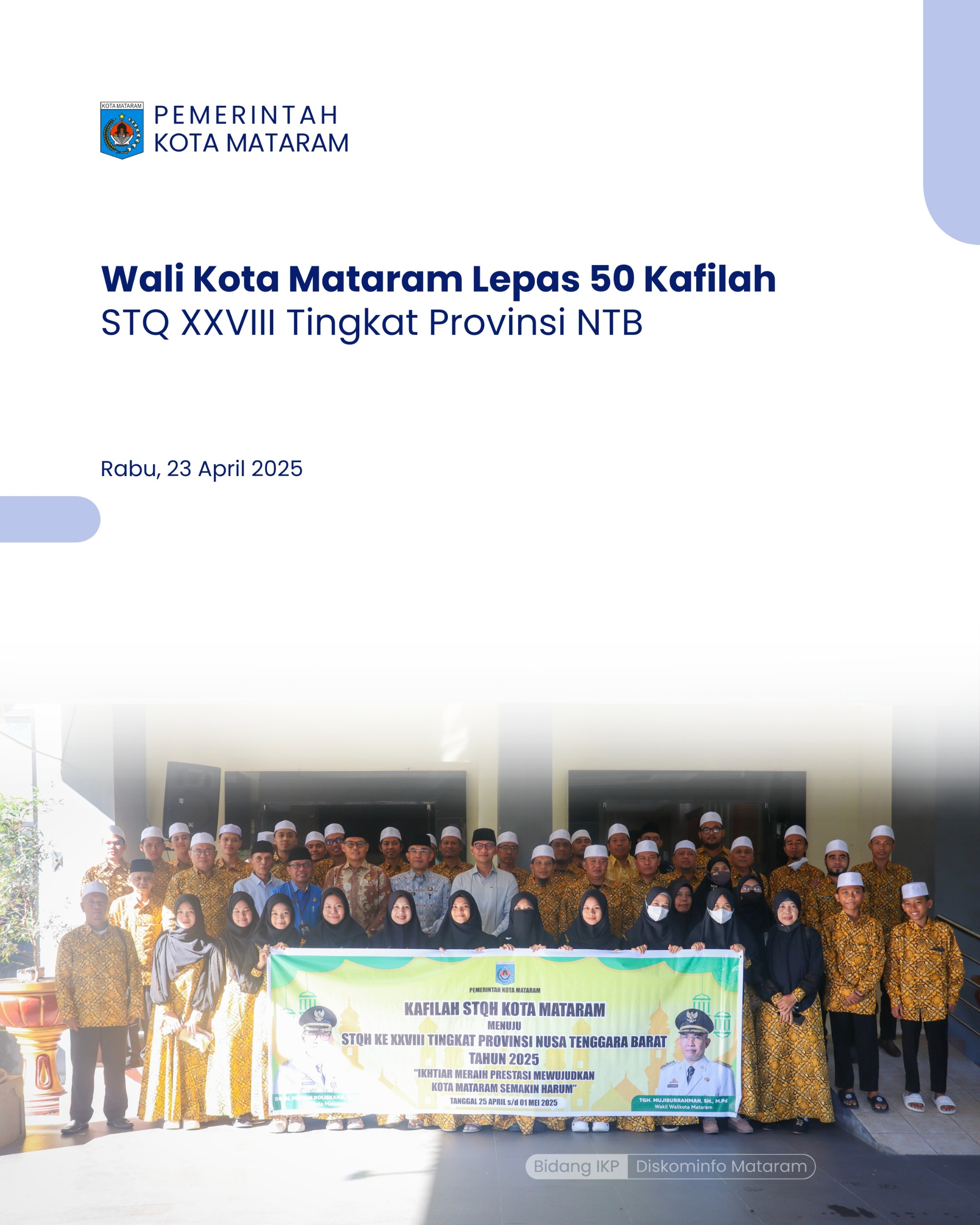 Mataram – Sebanyak 50 kafilah Kota Mataram yang akan mengikuti Seleksi Tilawatil Qur’an (STQ) XXVIII tingkat Provinsi Nusa Tenggara Barat di Kabupaten Sumbawa secara resmi dilepas oleh Wali Kota Mataram, H. Mohan Roliskana, didampingi Wakil Wali Kota Mataram, TGH. Mujiburrahman, dan Ketua DPRD Kota Mataram, Abdul Malik, pada Rabu (23/04/2025), di Ruang Kenari, Kantor Wali Kota Mataram.