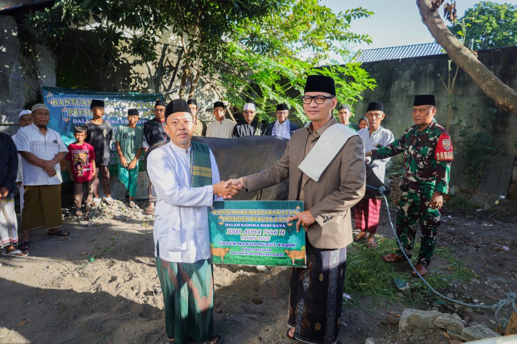 Mataram, — Menyambut Hari Raya Idul Adha 1446 Hijriah, Presiden Republik Indonesia Prabowo Subianto menyerahkan satu ekor sapi kurban untuk masyarakat Kota Mataram melalui Masjid Nurul Yakin di Kelurahan Bertais, Kecamatan Sandubaya. Penyerahan secara simbolis dilakukan oleh Wali Kota Mataram, H. Mohan Roliskana, pada Jumat (6/6/2025) di halaman masjid setempat.