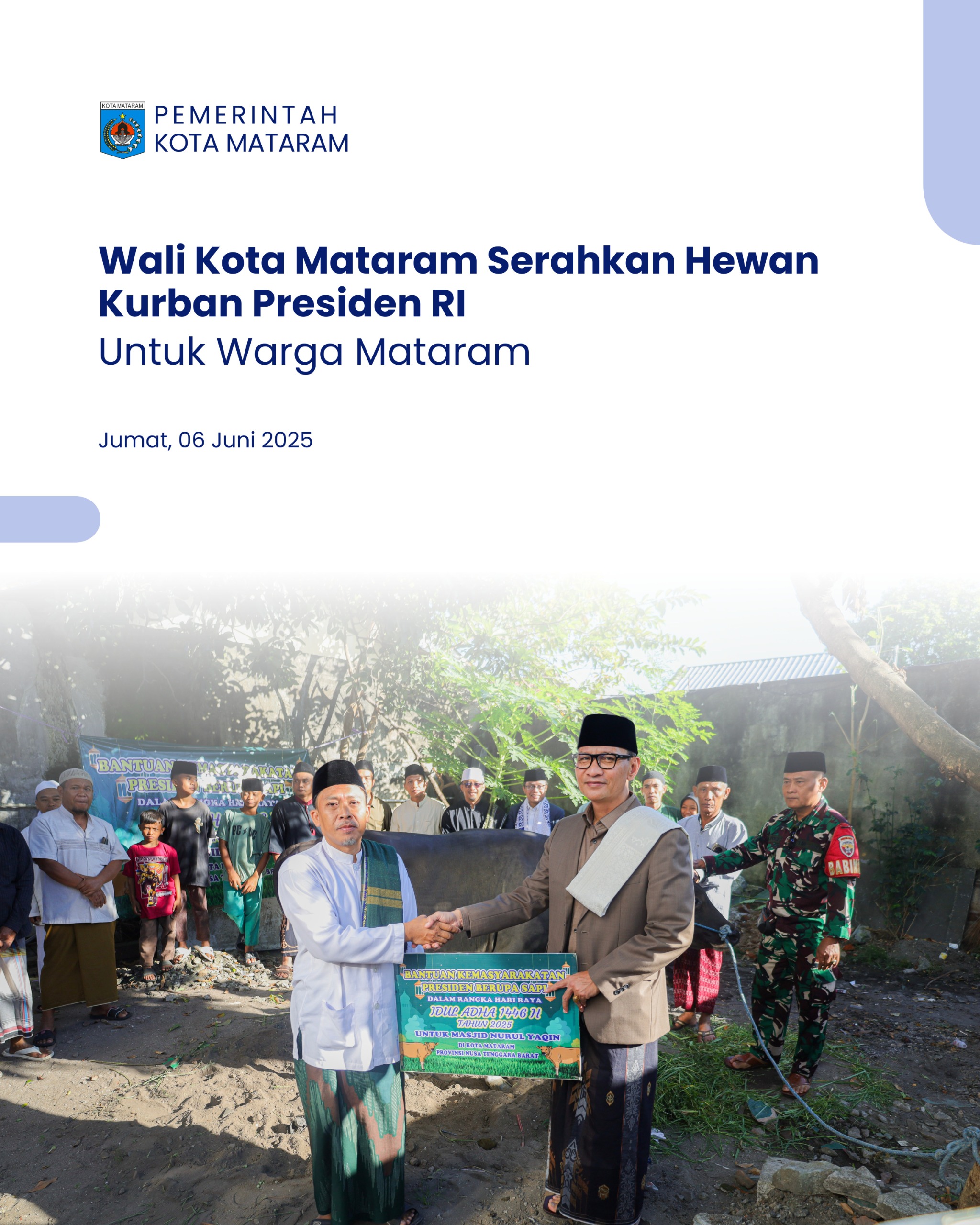 Wali Kota Mataram menyerahkan langsung sapi kurban kepada Ketua Takmir Masjid Nurul Yakin, Lalu Suhaimi, disaksikan oleh tokoh agama, pengurus masjid, serta warga sekitar yang turut mempersiapkan rangkaian pelaksanaan ibadah kurban di lingkungan mereka.