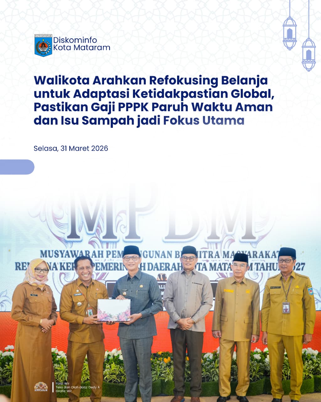Mataram — Pemerintah Kota Mataram menegaskan komitmennya untuk tetap menjaga keberlanjutan tenaga Pegawai Pemerintah dengan Perjanjian Kerja (paruh waktu), di tengah kebijakan efisiensi anggaran yang harus dilakukan akibat dinamika geopolitik global, dan tekanan ekonomi yang menyertainya. Di samping itu, isu penanganan sampah tetap menjadi prioritas yang utama dalam tahun 2026 hingga 2027.